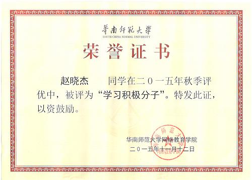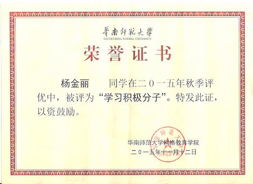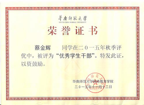 2015年9月,华南师范大学网络教育学院按照全面发展、客观公正的原则对2014年春季入学的学员进行“学习积极分子”、“优秀学生干部”的评选。