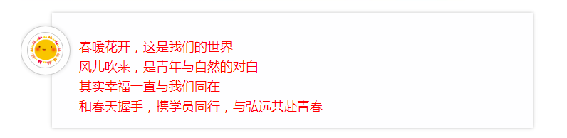 这场“走进自然,与弘远共赴青春”的活动在大家持续高涨的情绪中落下了帷幕,原本互不相识的大家,在活动中都能互相配合协助,像一家人似的,非常有爱。小弘远希望学员们在弘远这个大家庭中一起进步,一起成长,在此收获学习,收获快乐,收获友情,收获更多......