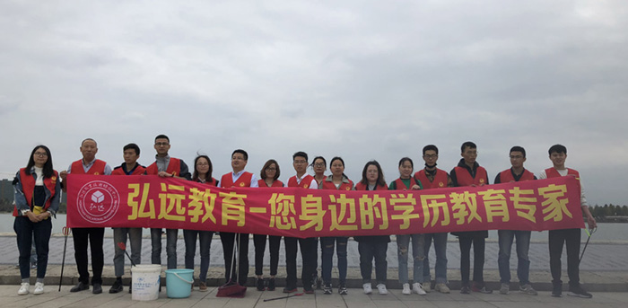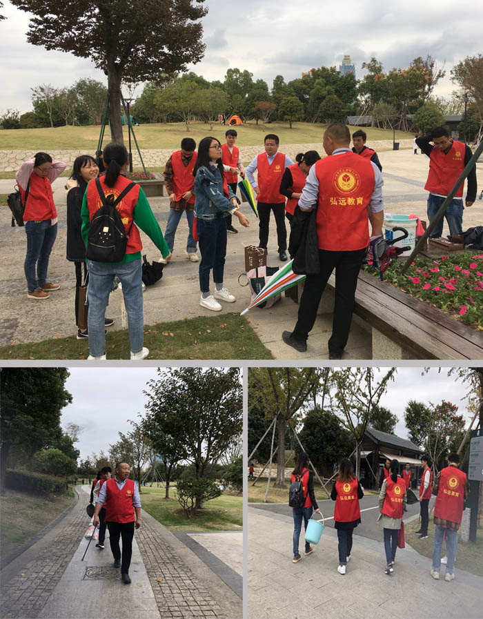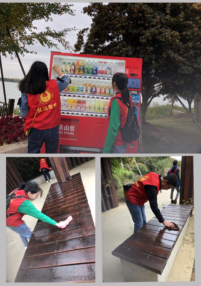 下午1点,弘远学子在弘远教育老师的带领下,来到了凤凰湖边,积极主动地领取垃圾袋、抹布等工具之后,大家分成了两组。