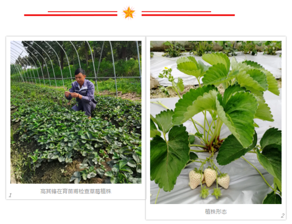 高其锋,2020届园艺专业毕业,助理农艺师职称,在工作中学习致用,将所学知识运用到草莓杂交育种当中,取得了显著的成绩,运用目前市面上所流通相关白草莓母本,经过不断杂交组合选育和提纯复壮,培育出了植株高大,果形大(最大果80克),果肉硬(便于运输),糖度高(折射仪测定14度),口感好,果皮纯白,籽红的新品种草莓,目前正在进行新品种审报。