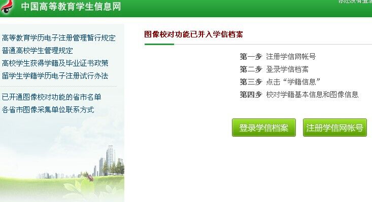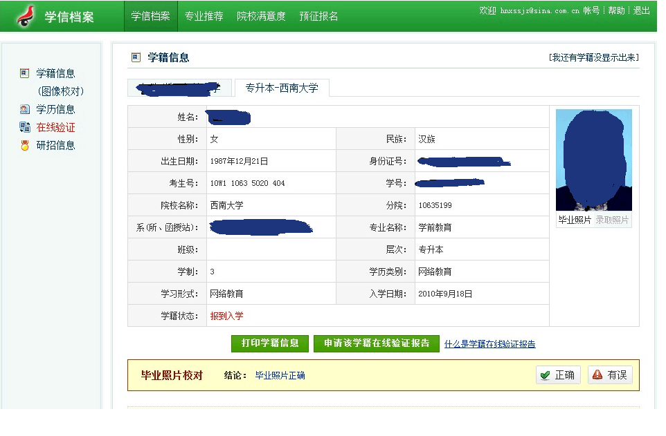 通知:各位1309西南学员,请于11月18日之前登录中国高等教育学生信息网(http://www.chsi.com.cn)进入学历电子注册图像校对系统进行网上信息校对,此信息关乎毕业证信息是否正确,逾期责任自负!具体操作办法按以下步骤进行: